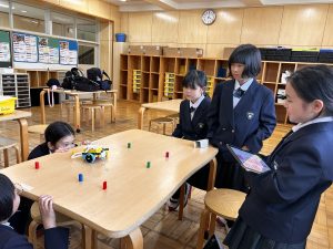 回の目標は全員がコーディングの体験をすることでした。5年生が「これで合っているかわからない。」と不安そうにしていました。6年生が「がんばってね。」と優しく応援をしていました。さらに、うまくいかなかったことには「こうするとどうかな。」とアドバイスを送っていました。その声掛けがあり、5年生もコーディングや試行錯誤を楽しむ体験をすることができました。