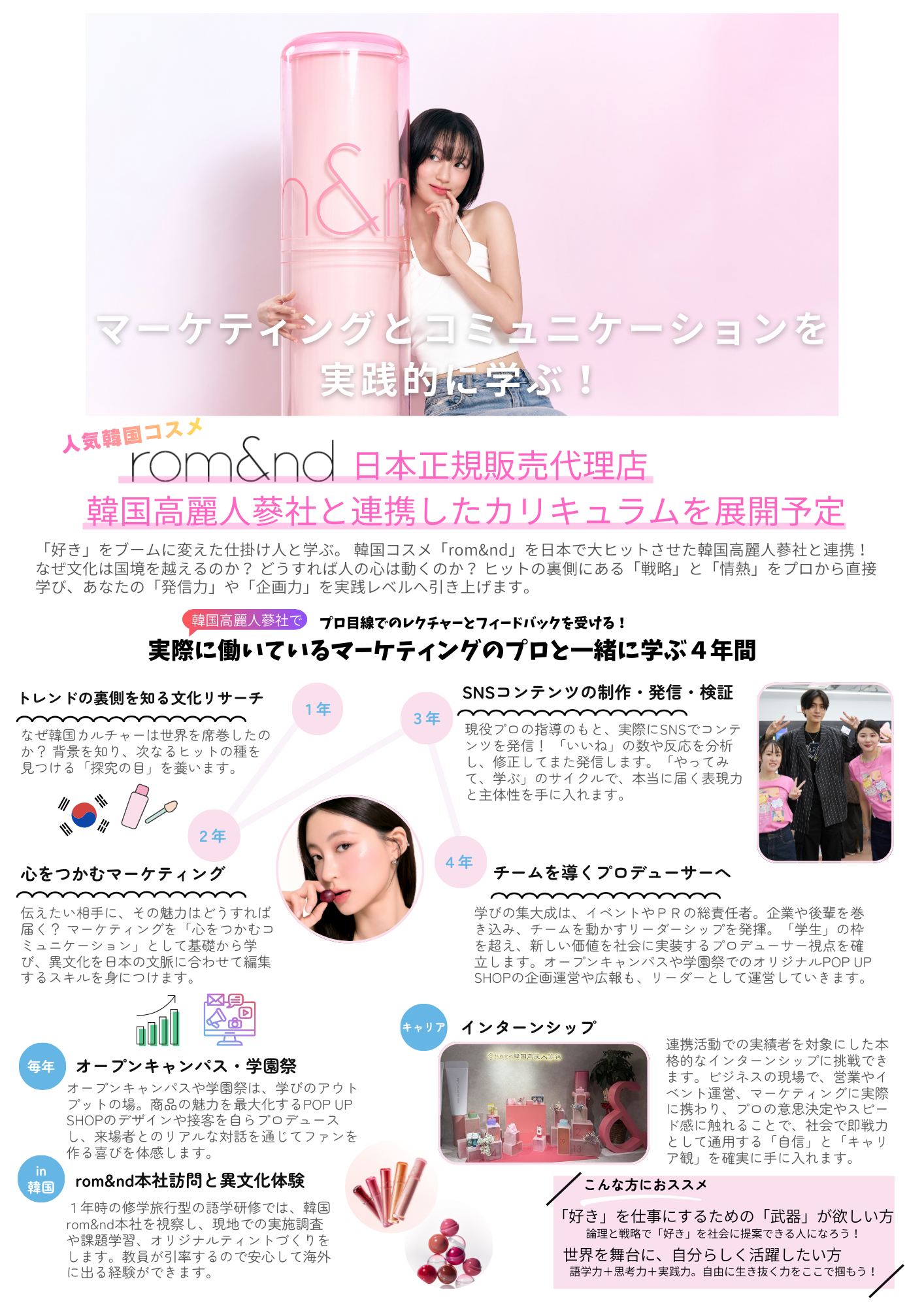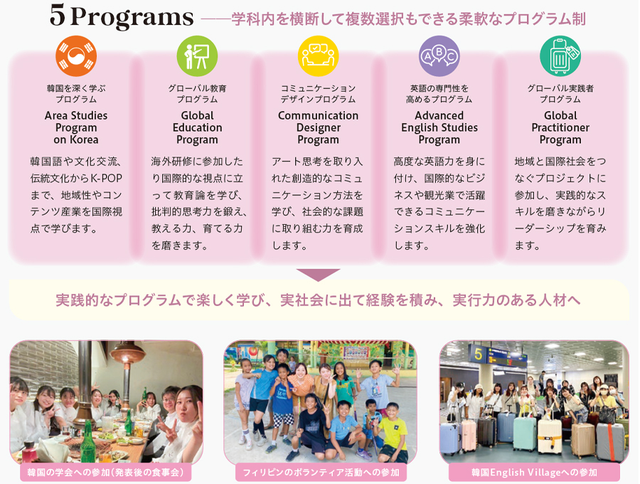 K-POP や韓国ドラマを「観る」だけでなく、より深く「語り」、そして「つながる」学びを提供します。推しの言葉を直接理解できる韓国語学習はもちろん、韓国の最新トレンドやエンタメ業界のしくみをAIを活用しながらリアルタイムでキャッチし、情報発信のスキルも磨いていきます。留学・研修に加え、韓国が好きな人が集まるKコミュニティを通じた交流が可能です。推し活×学びの場で、好きなことを「学問」として深め、共通の情熱をもつ仲間とつながる新しい学びを体験してみませんか?