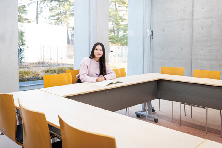 陽の光が気持ちの良い2126教室。スピーキングのクラス「Speaking Skills」の授業もここで行いました。少人数制なので、ネイティブの先生と会話できる時間が充実しているのも、相模女子大学の魅力と感じています。