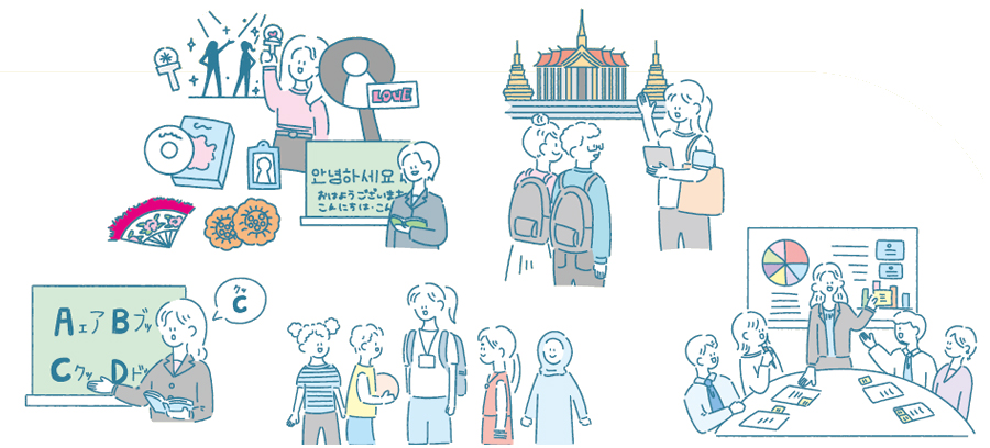 国際ビジネス、観光、メディア、教育、地域振興など、多彩な分野での活躍が可能です。多文化理解と語学力を活かし、企業の海外展開や自治体の多文化共生プロジェクト、観光ガイドや通訳、国際教育機関での勤務、さらには海外就職もめざせます!