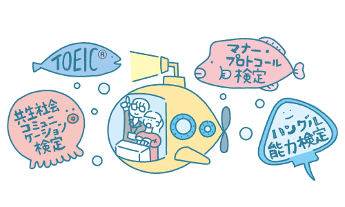 ○日本語教育能力検定試験 ○ TOEFL® ○ TOEIC® ○ IELTS™ ○全国通訳案内士試験(英語・韓国語) ○JTA 公認翻訳専門職資格試験 ○実用英語技能検定 ○観光英語検定 ○サービス接遇検定 ○世界遺産検定 ○ビジネス実務マナー検定 ○韓国語能力試験TOPIK ○ハングル能力検定 ○共生社会コミュニケーション検定 ○ユニバーサルコミュニケーションデザイン ○ワークショップデザイナー ○日商ビジネス英語検定 ○マナー・プロトコール検定 ○ITパスポート試験 ○色彩検定®