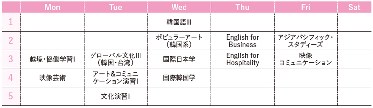 Area Studies Program on Koreaと Communication Designer Program の2つのプログラムの横断修了をめざす3 年生の春学期、プログラムの修了要件になっている科目(プログラム必修科目)をメインに履修した時間割モデルです。