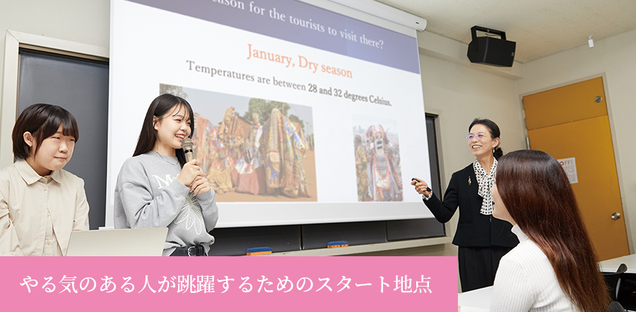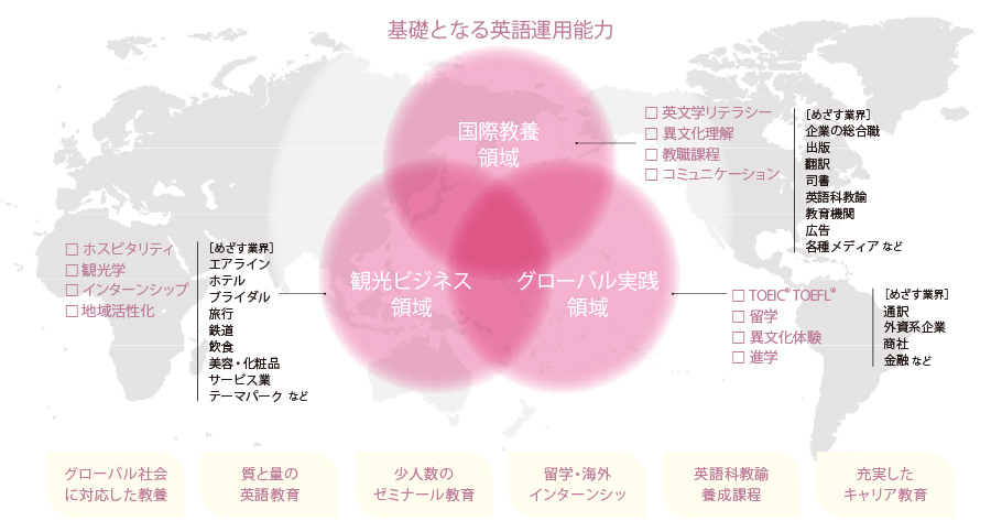 英語教育を基盤とし、幅広い教養と社会で通用する専門性を身に付ける「国際教養」「観光ビジネス」「グローバル実践」の3領域を設け、学生個々の興味や関心に合わせて履修ができる体制を整えています。また、社会に出るための準備としてインターンシップ、キャリア教育にも力を入れています。