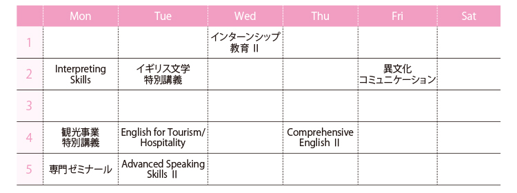 指導教員の専門ゼミナールで論文、翻訳作品などの卒業研究に取り組みます。英語科目では「上級英語演習Ⅱ」や認定科目の「検定英語Ⅱ」で、培ってきた英語力を集大成します。