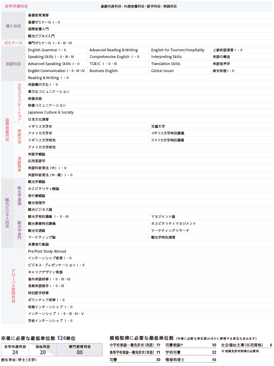 英語科目は細分化され、観光ビジネス科目では「観光学概論」「ホスピタリティ概論」「旅行業概論」で基本を学びます。インターンシップや長期海外留学の機会もあります。