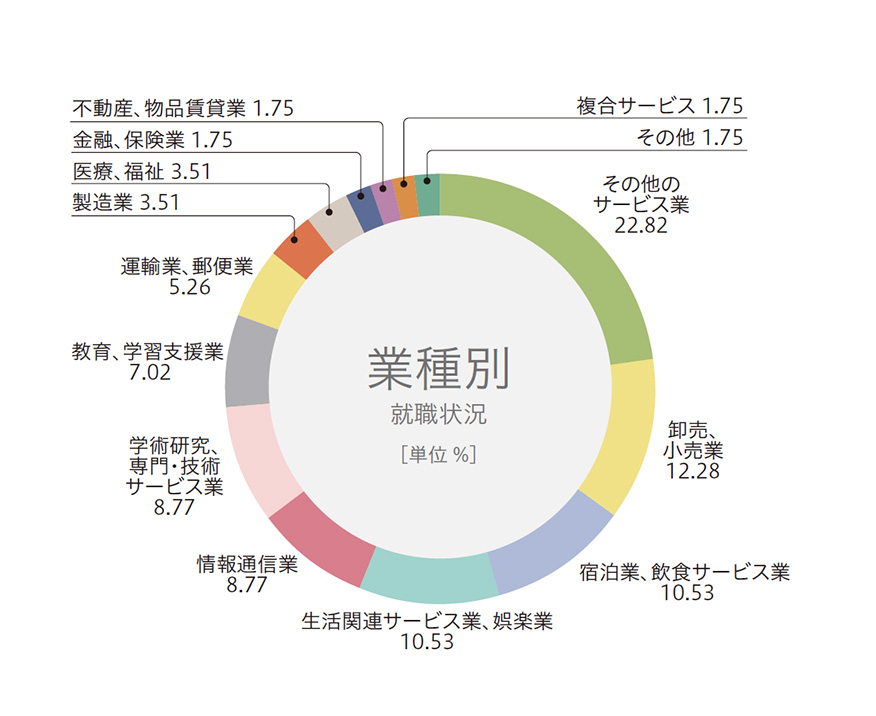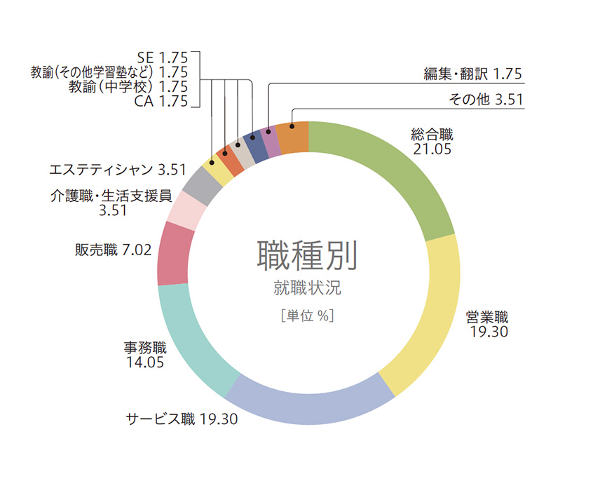 企業(総合職)、サービス、旅行、エアライン、ホテル、ブライダル、テーマパーク、鉄道、飲食、美容・化粧品、アパレル、出版、広告、コンテンツ、メディア、翻訳、司書、英語教師、通訳、外資系企業、商社、金融、公務員・団体職員、企業(事務職)、建設・建築、物流 など