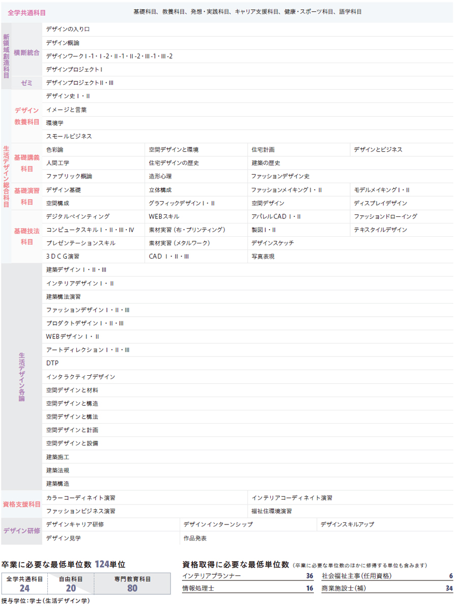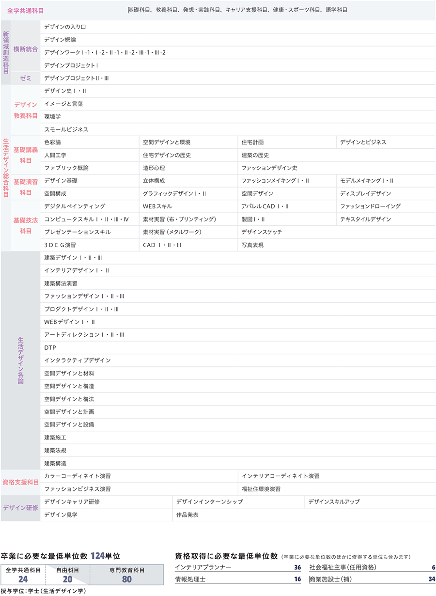 生活デザイン学科のカリキュラムは5つの群:新領域創造科目、生活デザイン総合科目、生活デザイン各論、デザイン研修科目、ゼミナールで構成されています。以下の各群指針と学修目標を理解した上で、各自で卒業単位を満たすように履修する科目を構成してください。