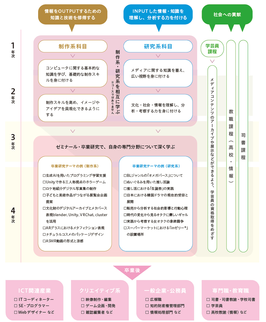 ITコーディネーター、Webデザイナー・プロデューサー、雑誌などの編集者・DTPデザイナー、映像制作・編集、ゲーム企画・開発、広告代理店・グラフィックデザイナー、企業・自治体のプレス・広報職、SE・プログラマー、モバイル通信エンジニア、学芸員、高校教諭(情報)、司書、大学院進学