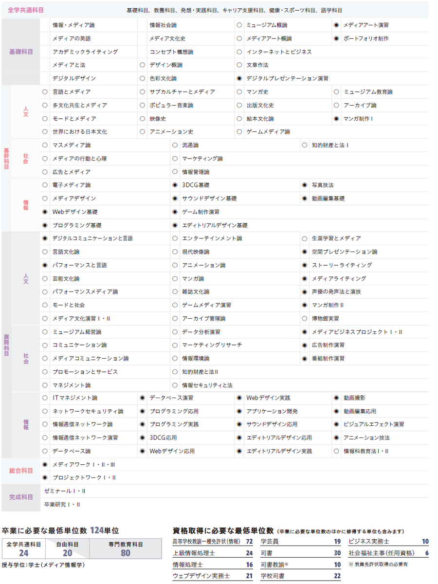 学生は、3年次でゼミナールを選択し、卒業制作もしくは卒業研究で4年間の学修の集大成を行います。また、メディア情報学科では、高等学校教諭一種免許状(情報)の取得に対応する科目群、学芸員資格の取得に対応する科目群を置いています。