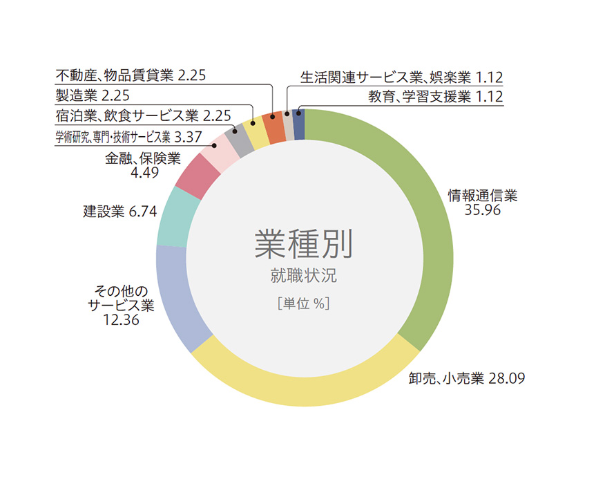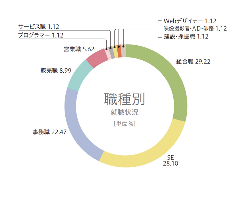 本学科生は、多数がシステムエンジニア(SE)として就職するほか、情報通信、映像、広告、金融、サービスなど、幅広い業種の総合職、事務職、営業職として活躍。大学院進学者もいます。