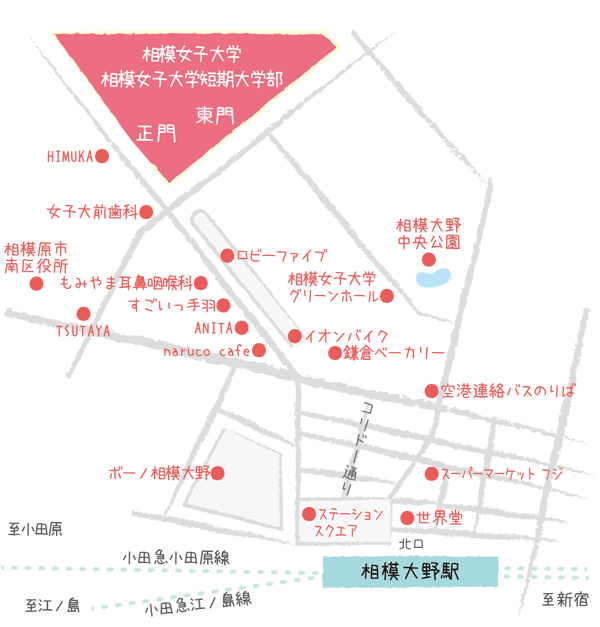 小田急線の急行が停まる相模大野駅には、大型の商業施設やホテル、飲食店などがあります。付近には大学が多いため学生向けのお店も豊富です。相模女子大学は駅北口から徒歩約10分です。