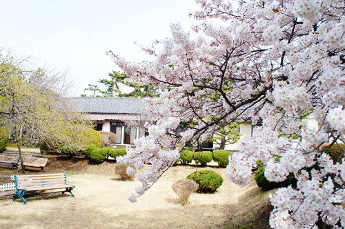 春は桜、夏は緑の葉がたくさん茂り、秋は銀杏、冬は梅や雪景色。