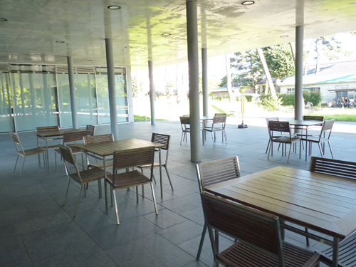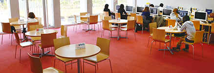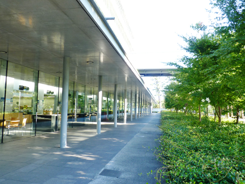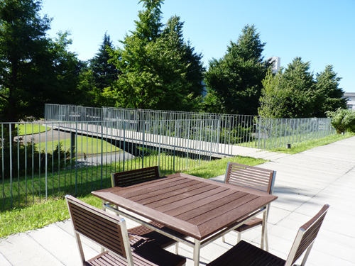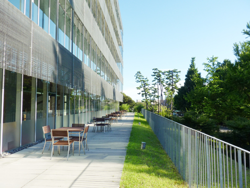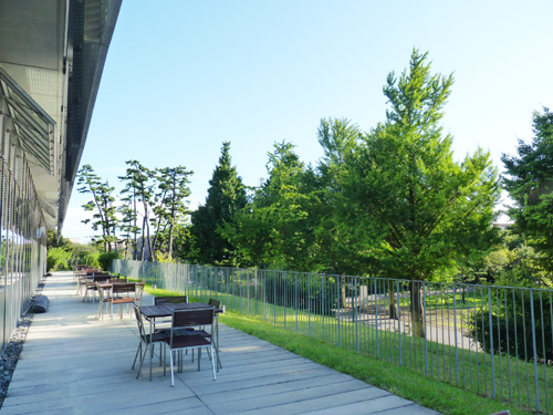 マーガレット本館東側には黒松林があり、また南北にはテーブルと机がある休憩スペースとなっています。2階にもテラスがあり、天気のいい日には、昼食をとる学生の姿が多く見られます。