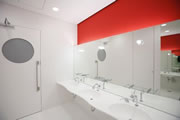 2階のテーマカラーは「赤」です。真っ白な化粧室の壁の一部もテーマカラーを取り入れています。