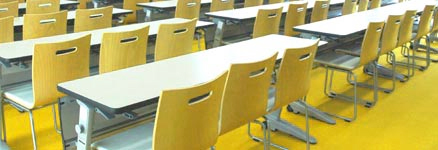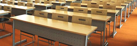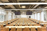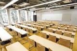 3階には200名近く収容できる講義室を2つ備えています。後ろの席でも授業がしっかりと受けれるよう、テレビ等を配置しています。