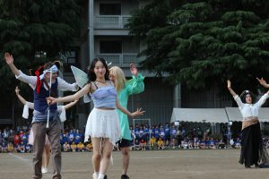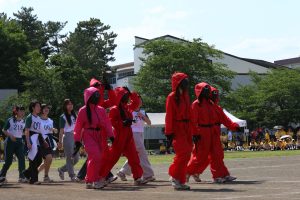 学年別の種目やクラス対抗リレーなど、どの競技も大盛り上がり。そしてプログラムの最後を飾るのは、本校伝統の高校3年生による仮装行列です。各クラスが衣装やダンス、音楽に工夫を凝らし、渾身のパフォーマンスを披露しました。