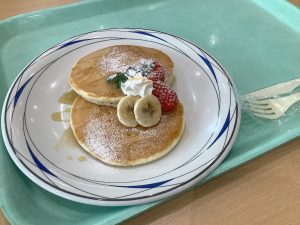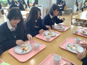 この日はクラス懇談会や高1保護者を対象とした進路ガイダンスも行われ、保護者会の終了を待つ間、生徒たちはカフェテリアで大学マンドリン部による演奏を聞きながらイチゴのパンケーキをいただきました。新緑に囲まれて食べるパンケーキの甘さに思わず笑みがこぼれます。