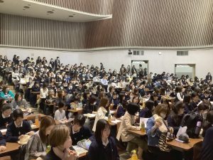 その後は保護者とともに説明会場へ。新しい学科への注目もあってか、大学3号館での全体会は立ち見が出るほどの大盛況でした。