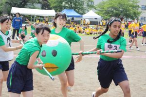 昨年度の体育祭はコロナで応援団がなかったのですが、今年度の体育祭は応援団も復活し賑やかで楽しい体育祭になりました。その中でも今回私が楽しかったことは、さがっぱ運びリレーです。4人1組で2本の長い棒を持ち、「さがっぱジョー」を運ぶリレー形式の中学部種目です。中学部体育祭運営委員では、バランスボールをさがっぱジョー風にペンキ塗りするところから始まりました。ペンキ塗りはとても大変だったのですが、先生方や生徒から「かわいい」と言ってもらえて嬉しかったです。また、本番でも1〜3年生が笑顔でやっていてこの競技を企画して良かったなと感じました。