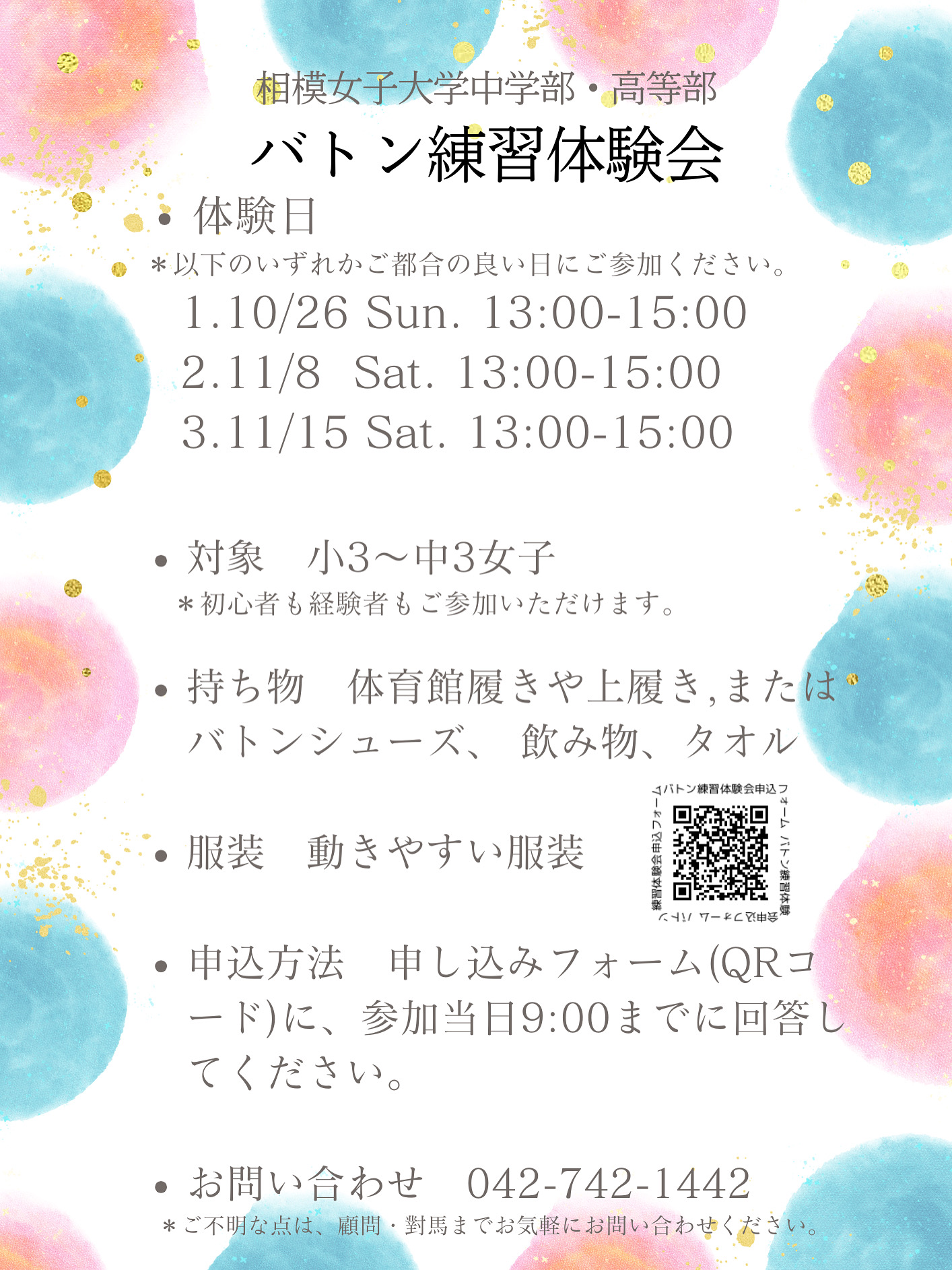 バトントワーリング部では、小学3年生〜中学3年生女子を対象に、バトン練習体験会を行います。初心者も経験者もご参加いただけます。ご都合の良い日にご参加ください。