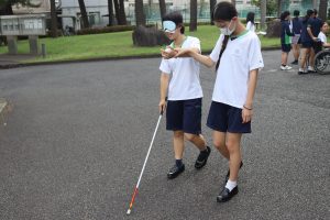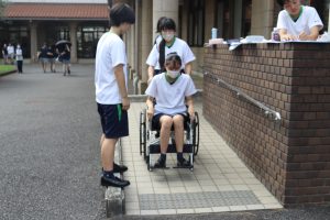 中学部1年のマーガレットタイムで、障がい者体験を行いました。この活動は多様性の理解を深めることを目的としています。校舎内や学園構内の普段行き来する場所で、車いすや白杖を使っての移動や、簡単な介助を体験しました。生徒からは「ほんの少しの段差を乗り越えるのが大変だった」「車いすは介助してもらっても、下り坂が怖かった」などの感想を聞くことができました。また介助する側の体験も貴重なものだったようです。