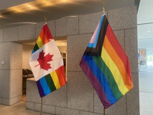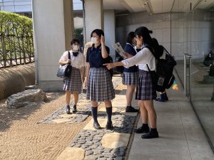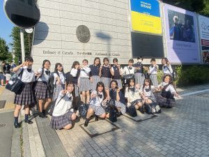 高2グローバルコースの生徒たちが、MQ Week(探究活動)の一環として、カナダ大使館を訪れました。入館前に空港を思い出させるような入念なセキュリティチェックを受けると、気分はすっかりカナダ。至るところの案内表示は日本語、英語、フランス語。職員の方とお客様の会話は英語やフランス語。カナダの国旗とレインボーフラッグに迎えられ、3ヶ国語で書かれたパンフレットをじっくりと読みながらカナダ・ガーデンを見学しました。一見するとただのオブジェクトも、カナダの歴史や地理、日本との関わりなどを意識しながら見学すると意味の深さが伝わり、多くの発見や新しい視点を生徒たちにもたらしてくれました。