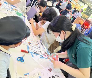 小田急電鉄相模大野エリア×相模女子大学×三菱重工相模原ダイナボアーズ 「コラボフェス2025」に参加しました2025 / 09 / 19 高等部ペーパークラフトやもころん体操で会場を盛り上げました! 9月13日(土)相模大野駅で行われたイベントに、相模女子大学子ども教育学科の学生とともに高等部生10名がボランティアとして参加しました。 地域の子どもたちと一緒にペーパークラフト作りを行ったほか、小田急電鉄株式会社の子育て応援マスコットキャラクター「もころん」のテーマソングに合わせたダンスで会場を楽しく盛り上げました。