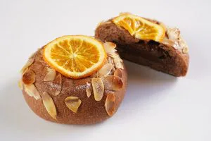 ~ココア生地でチョコとオレンジを包み、アーモンドスライスをトッピング。オレンジで、光り輝く太陽をイメージしました~