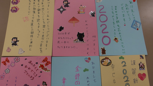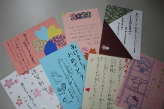 今回は日本語学科の4年生のうち45名が年賀状を書いてくれました。日本の文字、特に漢字は難しいようですが、「受け取った人が幸せになるように」という思いを込めて一生懸命に書いてくれたことが、かわいらしいシールやイラストで飾られたハガキから伝わってきます。