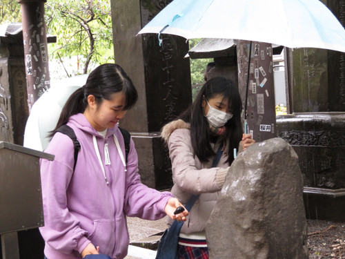 当日、まず訪れたのは「回向院」。明暦の大火で十万人以上の死者を出し、その死者を埋葬したのが始まりと言われています。敷地内には、相撲の新弟子たちが力を授かるよう祈願する碑としての「力塚」や、時代劇で有名な「鼠小僧次郎吉の墓」もありました。長年捕まらなかった運にあやかろうと墓石を削りお守りに持つ風習があり、今では合格祈願に来る人が多いと聞くと、生徒たちも懸命に削っていました。ここ回向院を母体とする両国幼稚園が隣にあり、芥川はそこに通っていました。