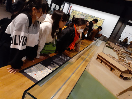 午後は「江戸東京博物館」へ。江戸時代の歴史や文化を、ガイドによる詳しい説明で知ることができました。社会科の授業で習っている範囲と重なる内容があると、中学生は興味津々に説明を聞いていました。江戸時代の出版物がどのように作られているのか等を知ることができました。