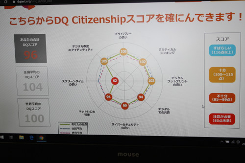 中学全学年で自らのDQを測る「DQテスト」を行いました。アンケート形式の64個の質問から現在のデジタル社会に直面する様々な課題にどう対応するかを答え、 結果が8つのカテゴリに分かれレーダーチャートとして表示されます。測定された自分のDQスコアを見ながら自分の弱い領域を認識します。 更に「DQWorld」というDQスキルを向上させるオンラインプラットフォームで学習し、世界基準に合わせてスキルを高めました。