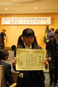 第21回神奈川大学全国高校生俳句大賞で入選をした高校2年の原澤さんが、3月10日の授賞式(神奈川大学横浜キャンパス)に出席しました。