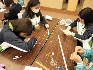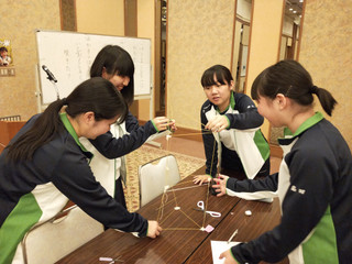 教員チームが手こずる中、生徒の作るタワーはどれも独創性豊かな ものばかり。楽しい時間をみんなで共有して無事に1日目が終了し ました。