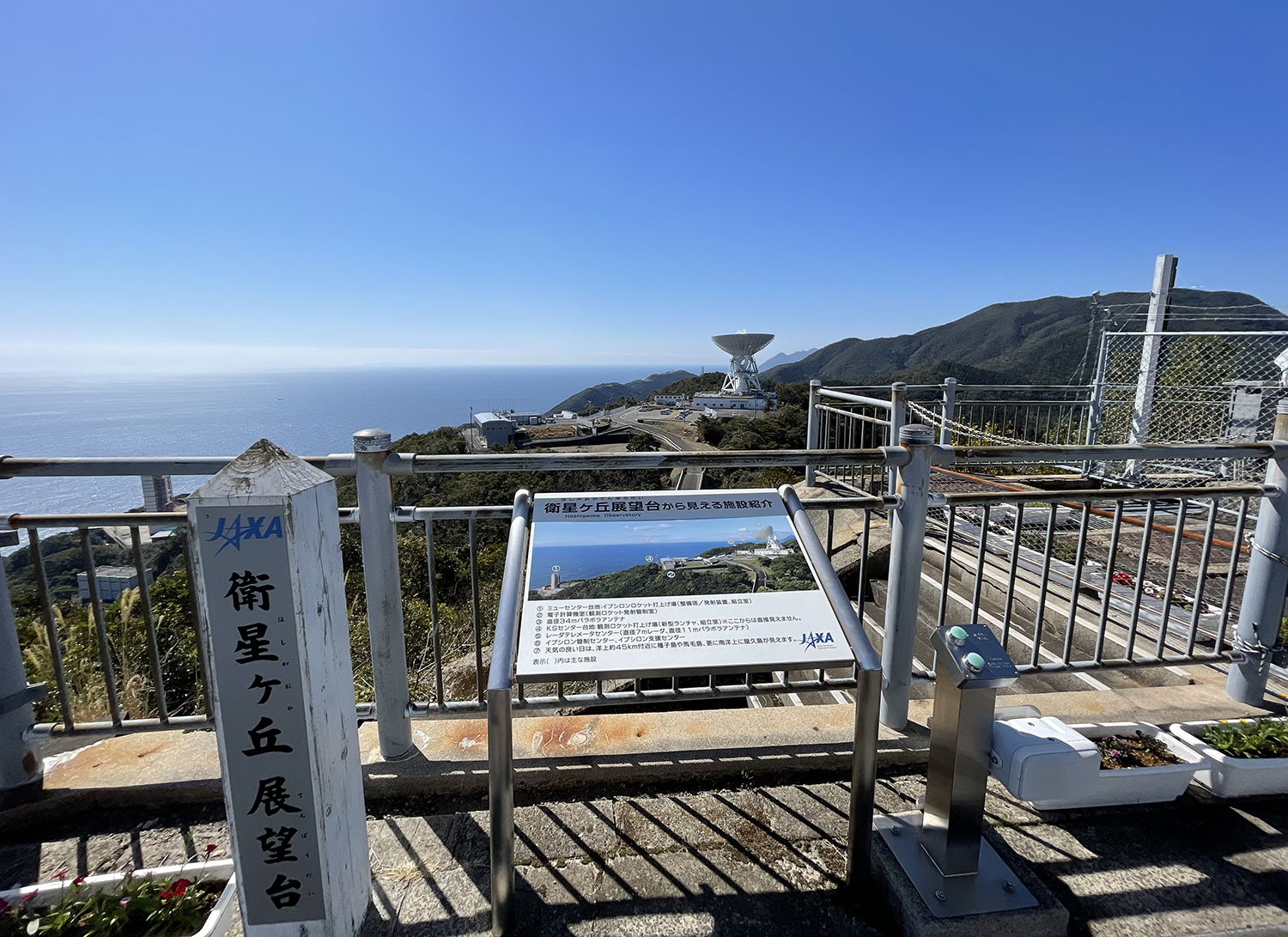 好きな場所の一つとして、JAXA内之浦宇宙空間観測所(USC)の衛星ヶ丘展望台(ほしがおかてんぼうだい)をご紹介したいと思います。ここは直径20メートルの通信アンテナが設置されている場所となっており、USC場内で標高が最も高く、周辺が一望できる景色のよい場所です。特に空気の澄みきった冬場は、遠くに種子島のシルエットが明瞭に確認できますし、さらに条件が良ければ屋久島の姿まで見通せることがあります。USCはJAXAが管理するロケット発射場ですが、制限エリア以外は一般の方の入場および見学が可能で地域の観光スポットにもなっています。この展望台は、職場では通称「20メートル」と呼ばれており、職員に対しては「20メートルに行ってくる」で十分に通じますが、一般の方には何のことやらさっぱりわからないでしょうね。
