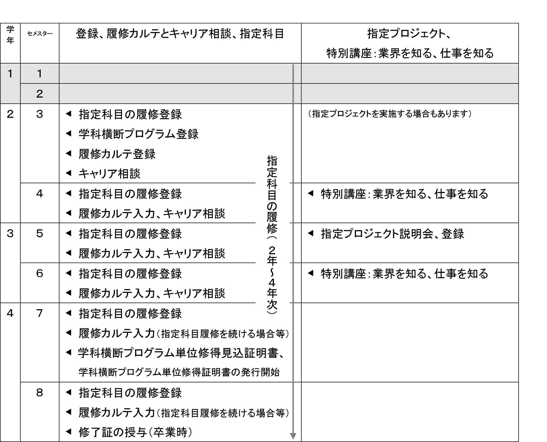 履修カルテを使って、将来の目標とそこに至る計画を整理し、履修した指定科目の記録、参加したプロジェクト等の記録をつけてください。詳しくはガイダンスで説明します。