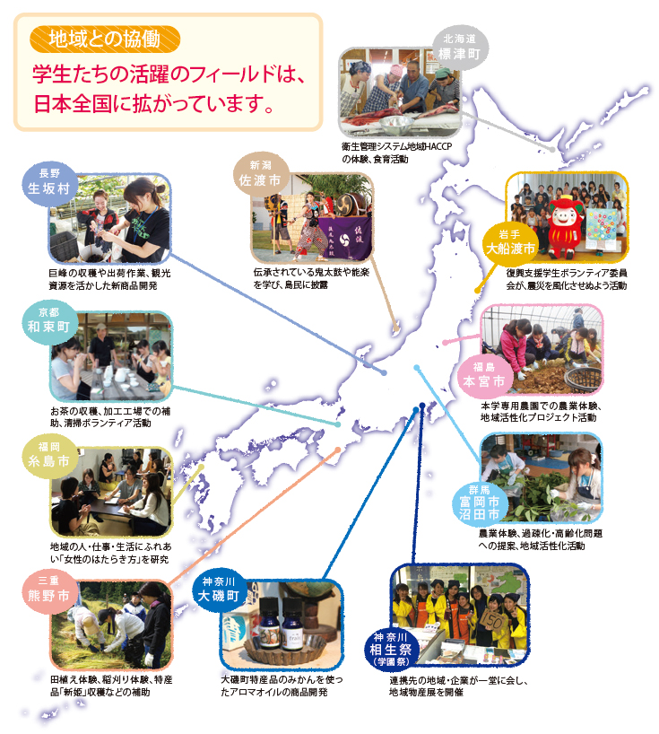 事業例:企業やNPOと学生をつなぐインターンシップの支援、地域をフィールドにした実践的な体験の場の提供。 - 新たな文化・福祉・産業の発展に寄与する(地域発展事業)