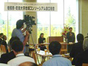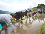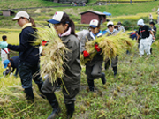 本学では2008年度に農林水産省の事業である「田舎で働き隊!」に参加し、15人ほどの学生が熊野市に1週間あまり滞在し、農村体験を行いました。この体験をきっかけに熊野市との交流が生まれ、継続的に活動を展開しています。具体的には、丸山千枚田保存活動や熊野市の交流人口の拡大、特産品作りのための取り組みを、現地での体験を通じて学ぶとともに、相生祭(学園祭)の地域物産展や百貨店での地域連携フェアへの出店の手伝い、公開講座の開催や市民向けツアー企画などを通して、熊野市の取組みを支援しています。熊野市を訪問した学生が、物産展の店頭でお客さんに自身の体験を交えながら熊野市を紹介するとともに、物販を行うなど、双方向の交流に力を入れています。