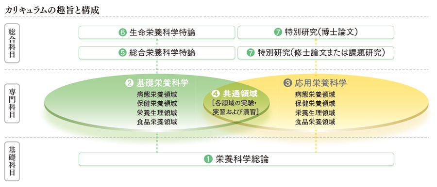 本研究科のカリキュラムは、生命体としてのヒトの生理機能や疾病の発症、病態にかかわる内容と、ヒトの生命維持の基本となる食にかかわる内容とを2本の柱とし、栄養科学を病態栄養、保健栄養、栄養生理、食品栄養の4領域から総合的・体系的に学べるように授業科目を構成しています。