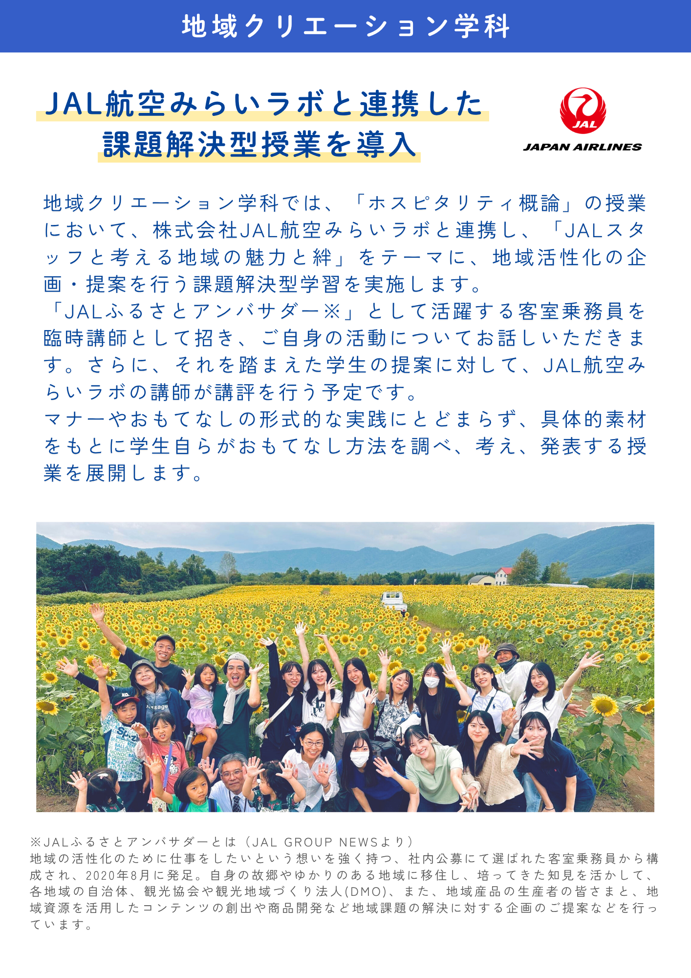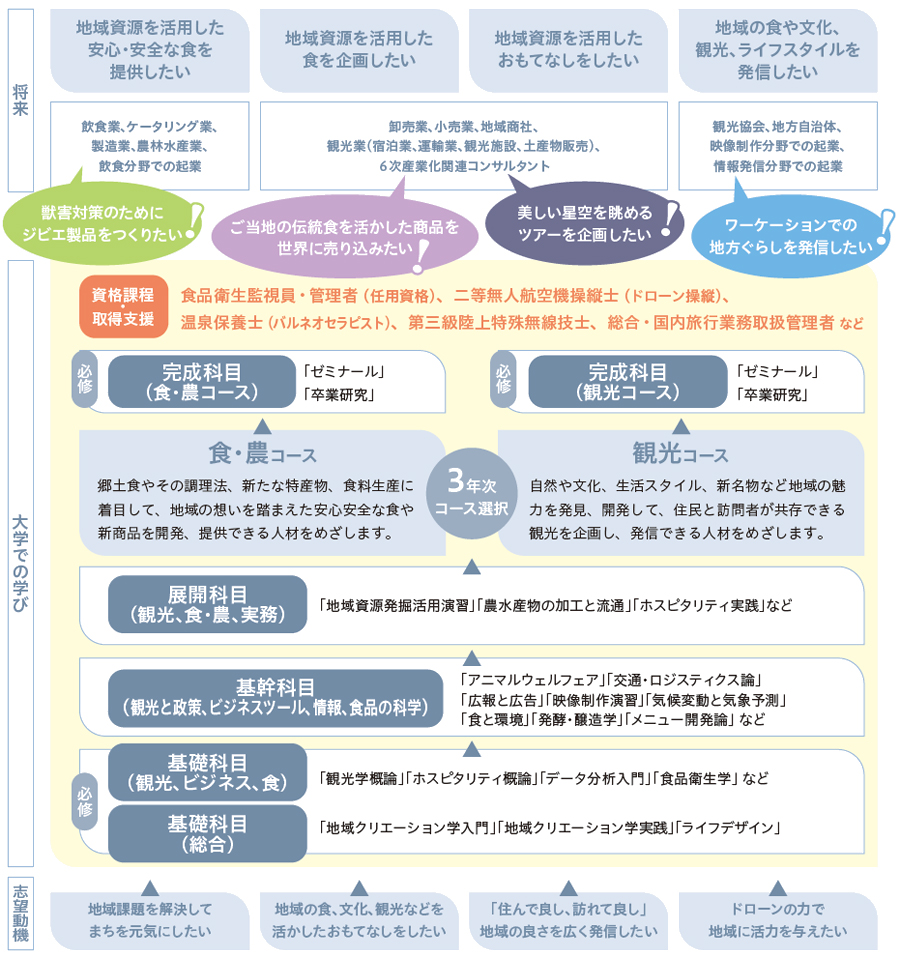 世界各地で自然災害や紛争が起こり、国内では少子高齢化や人口減少に伴う人手不足や耕作放棄地増加が深刻化するなか、食料不足や獣害、食中毒、観光公害の発生により日常生活が脅かされています。「地域クリエーション学科」は、資源発掘から利活用、情報発信まで地域を総合的にプロデュースできる人材の育成を通じて、住民、訪問者がともに幸せを感じる社会の実現に貢献します。