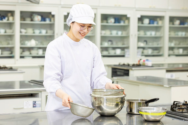 設備が整った調理室では、調理実習はもちろん、ソーセージやチーズづくりなどに挑戦する食品加工の実習や、子どものおやつを考えてつくる実習も行われます。食に関する幅広い学びの場です。