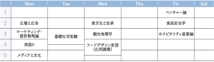 農水産物の加工と流通/地域栄養学/マーケティング・経営戦略論/テーブルコーディネート論(演習含む)/メニュー開発論
