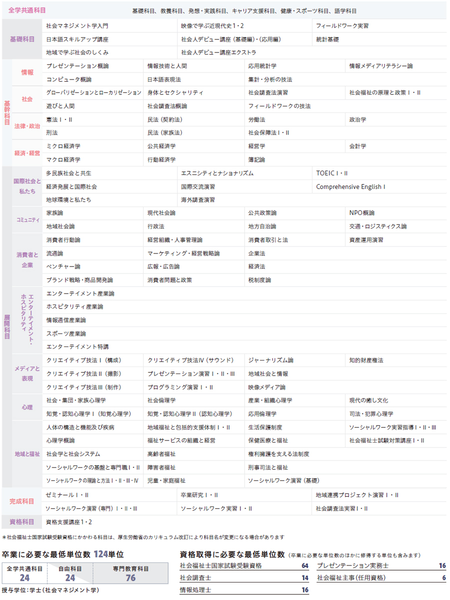 なお、社会福祉士課程を履修する学生に必要な科目は、「地域と福祉」のジャンルを中心に、カリキュラム・マップの全体に散りばめられています。社会福祉士課程の学生でなくても、いくつかの科目を除き、それらの科目を履修することができます。