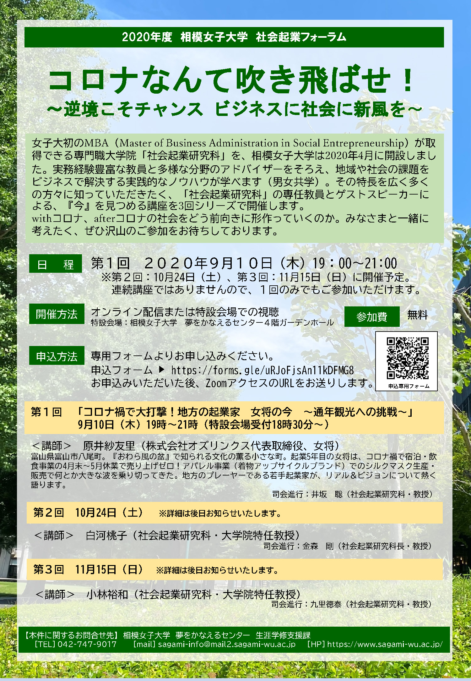 【社会起業研究科】2020年度 第1回 社会起業フォーラム「コロナなんて吹き飛ばせ!~逆境こそチャンス ビジネスに社会に新風を~」開催のお知らせ[9月10日・木曜日]
