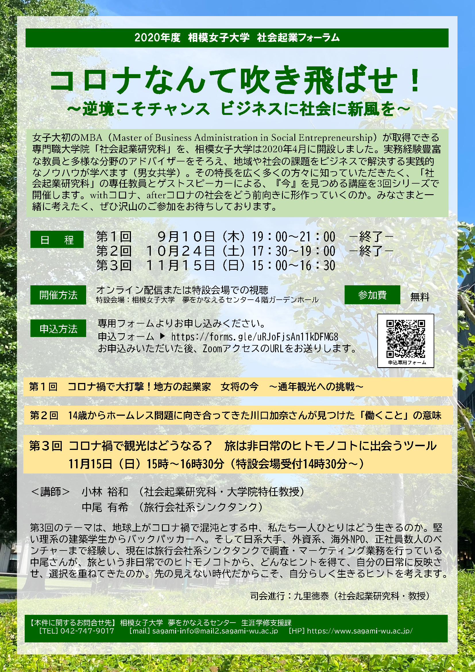 【社会起業研究科】2020年度 第3回 社会起業フォーラム「コロナなんて吹き飛ばせ!~逆境こそチャンス ビジネスに社会に新風を~」開催のお知らせ[11月15日・日曜日]