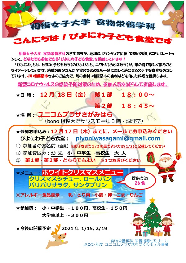 【食物栄養学科】2020年度 第2回『ぴよにわ⼦ども⾷堂』を開催します[12月18日・金曜日]