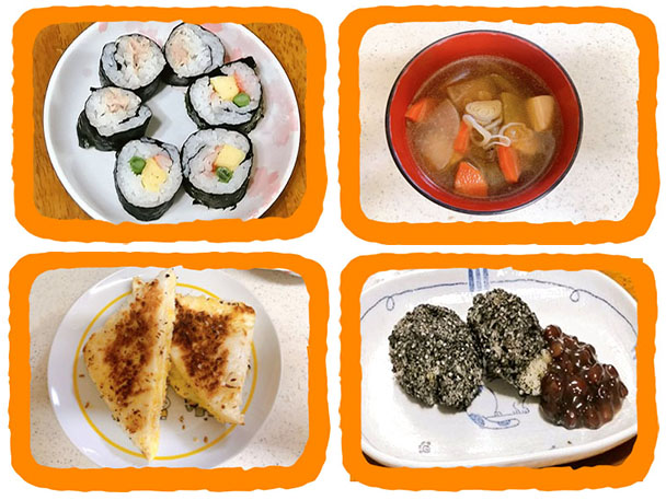 今回提案するメニューは『新春!お正月明けメニュー』として、身体が温まってほのぼのと和やかになる和風料理です。メニューは、「手巻き寿司」2種類、「けんちん汁」、「チーズはんぺん」、「豆腐ゴマ餅」です。ぜひ、お家で作ってみてください。