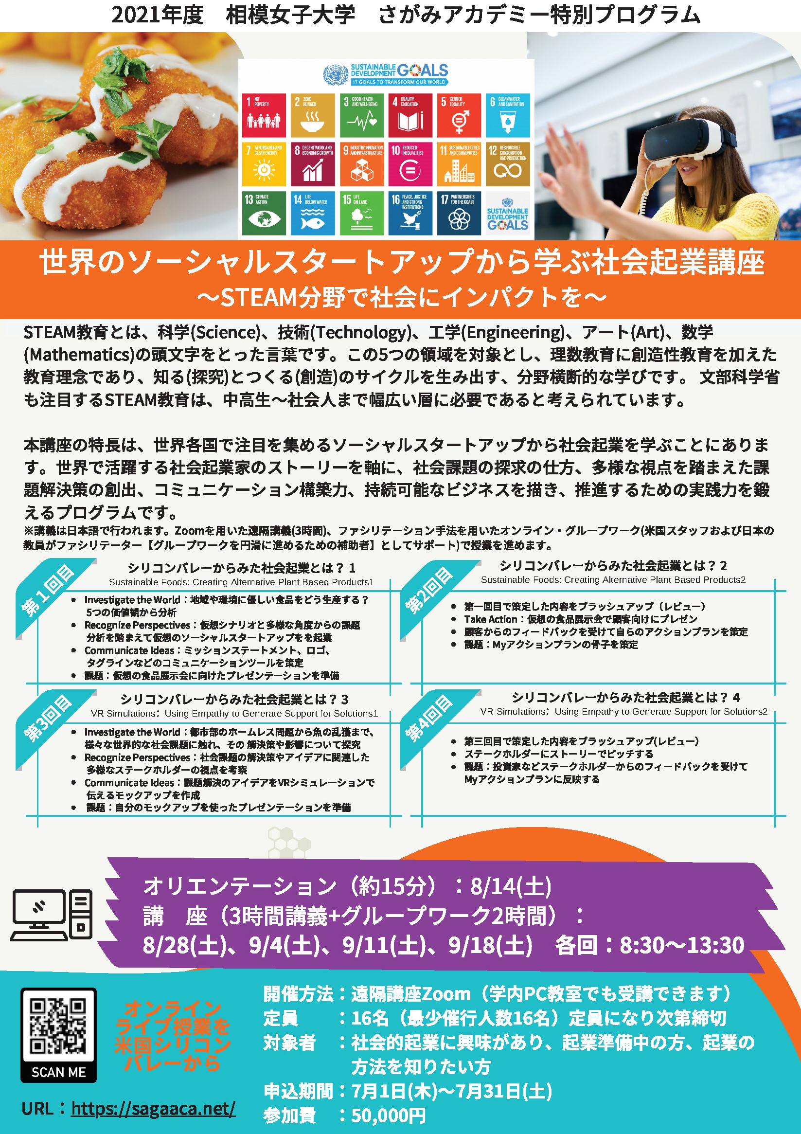 下記の日程にて、起業準備中の方や起業の方法を知りたい方を対象に、2021年度 さがみアカデミー特別プログラム「世界のソーシャルスタートアップから学ぶ社会起業講座 〜STEAM分野で社会にインパクトを〜」を開催します。