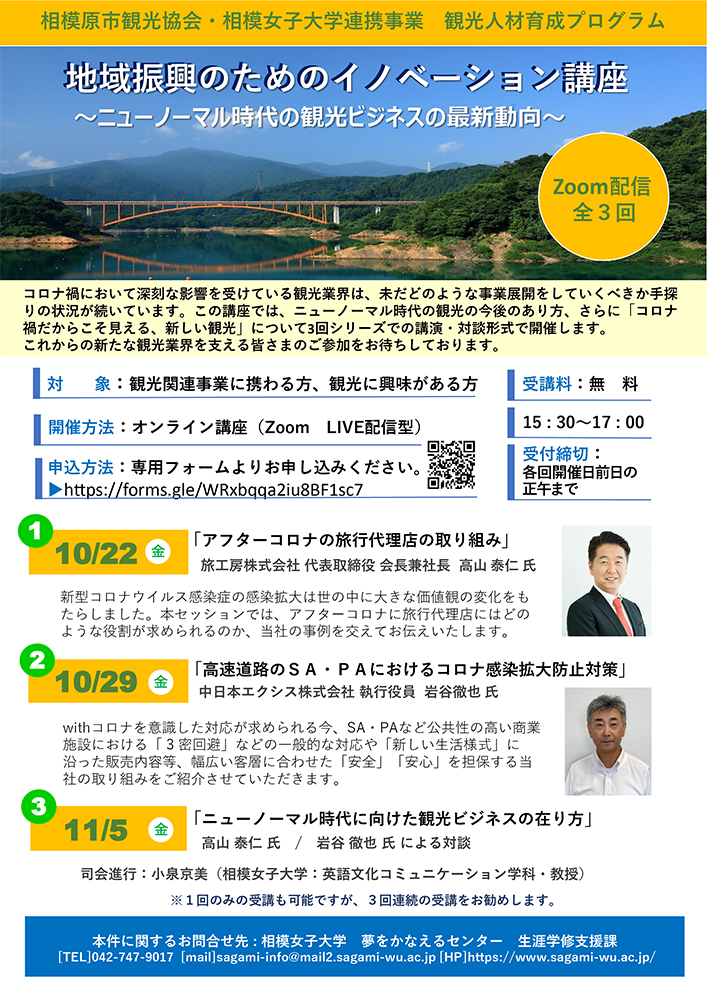 | 講座名 | 「地域振興のためのイノベーション講座 ~ニューノーマル時代の観光ビジネスの最新動向~」 |