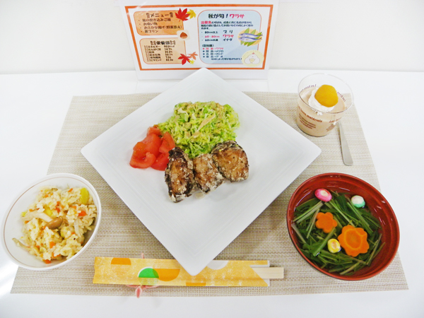 今回は「秋のあったかメニュー」として、JA相模原市様に配送いただいた旬の食材をたっぷり使いました。「秋の炊き込みご飯」には人参を細かくきざんで入れ、まるでモミジのような彩りでした。ワラサの「おさかな揚げ(野菜添え)」は提供する直前に油で揚げ、ふっくら柔らかで子どもたちもパクパク食べてくれました。デザートの「栗プリン」は少し硬めに仕上がってしまいました。